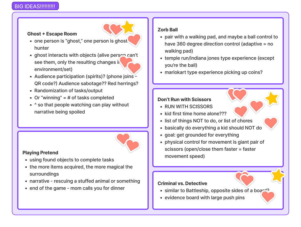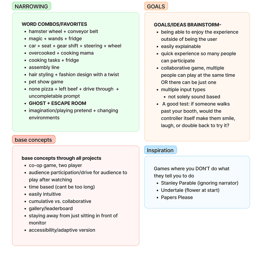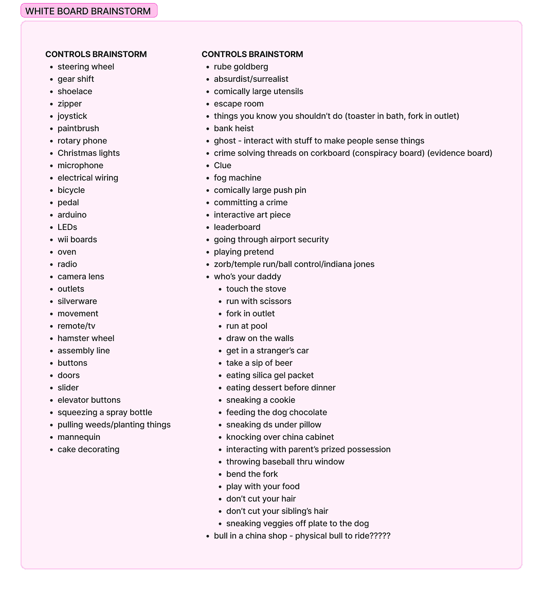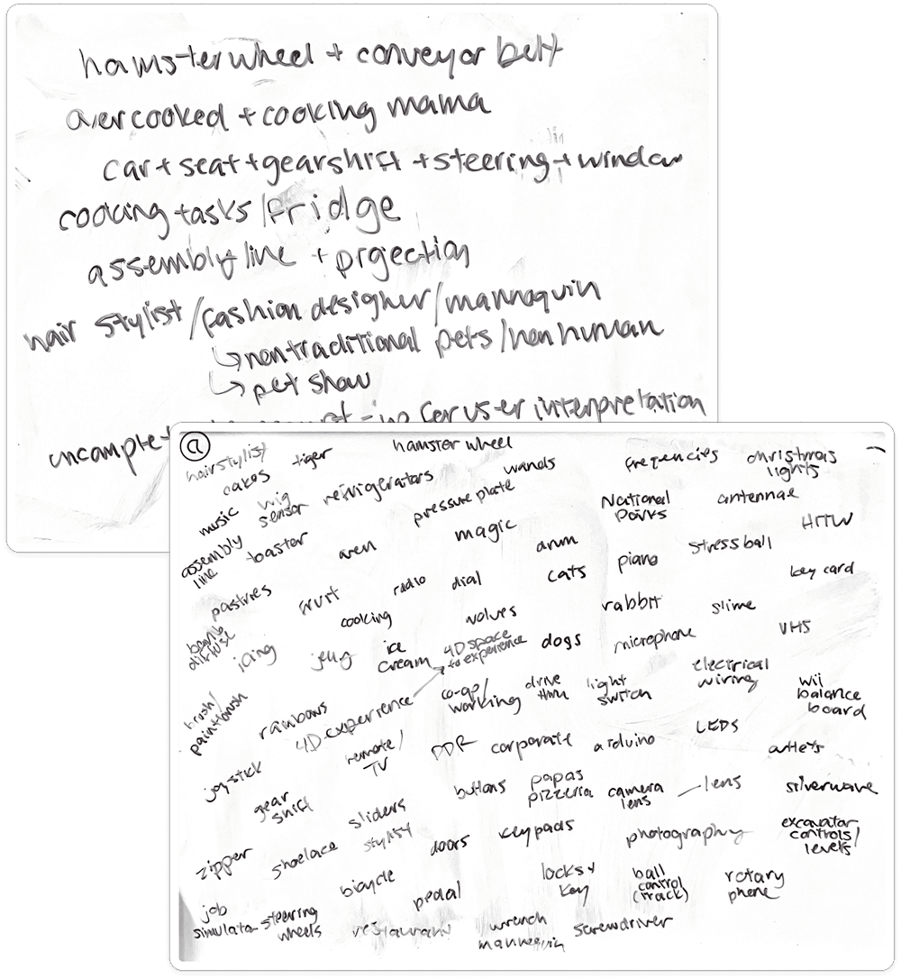We spent about two weeks completing sprint-like brainstorming sessions, such as brain-dumping words and objects, as well as drawing connections and parallels between types of interactions and content. We focused our brainstorming sessions on interaction first, in order to build our content around the controller.