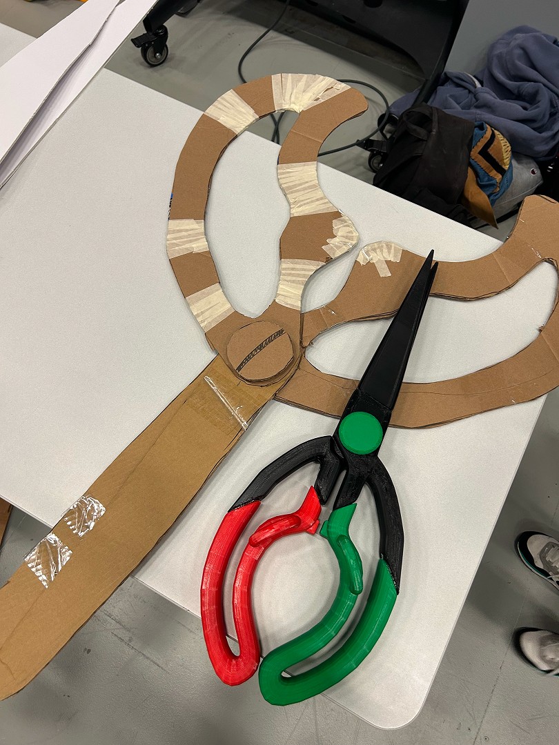 About a month into development, we had iterated several times on our scissor design to test user comfort, weight distribution, and hardware placement. Steering was still in development, but we had a Hall effect sensor working to detect open/close. During the playtest, we guided users around the map and allowed them to chop up our grayboxed house